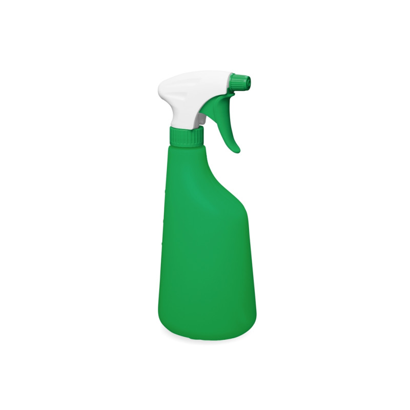 Пластиковый пульверизатор зеленого цвета с распылителем. Используется для распыления чистящих и моющих средств на различные поверхности. На бутылке есть шкала в мл и %.