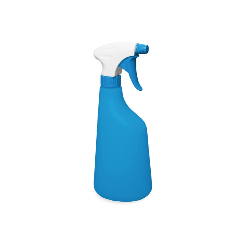 Пластиковый пульверизатор синего цвета с распылителем. Используется для распыления чистящих и моющих средств на различные поверхности. На бутылке есть шкала в мл и %.