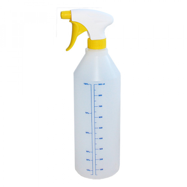 Пластиковый пульверизатор с распылителем желтого цвета. Используется для распыления чистящих и моющих средств на различные поверхности.