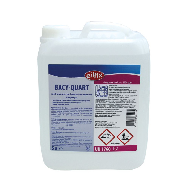 Bacy-Quart — моющее средство с дезинфицирующим эффектом для любых водостойких поверхностей. Используют на кухнях, в клиниках, домах престарелых и везде, где важно поддержание повышенных гигиенических стандартов. Bacy-Quart имеет широкий спектр действия против грамположительных и грамотрицательных микроорганизмов.