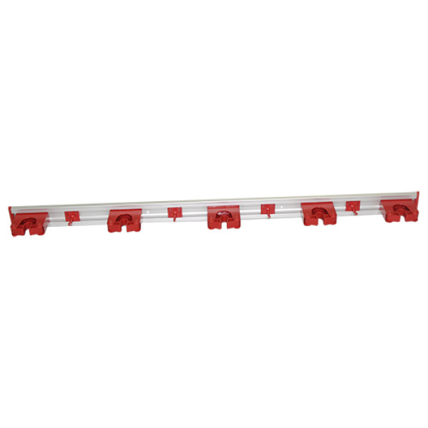 Профессиональный держатель инструмента идеально подходит для любого уборочного инвентаря. Длина 90 см с 5 держателями для рукояток диаметром от 20 до 30 мм и 4 крючками. Сами держатели и крючки регулируются на алюминиевой планке и могут комплектоваться дополнительными держателями. Доступен в 4 цветах в соответствии со стандартом HACCP. Поставляется вместе с винтами для подвешивания на стену.