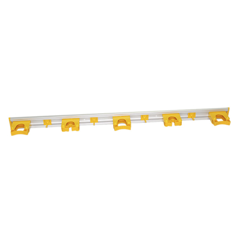 Профессиональный держатель инструмента идеально подходит для любого уборочного инвентаря. Длина 90 см с 5 держателями для рукояток диаметром от 20 до 30 мм и 4 крючками. Сами держатели и крючки регулируются на алюминиевой планке и могут комплектоваться дополнительными держателями. Доступен в 4 цветах в соответствии со стандартом HACCP. Поставляется вместе с винтами для подвешивания на стену.