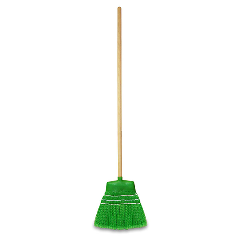 Метла с прочной пластиковой щетиной и деревянной рукояткой, является хорошей альтернативой традиционной березовой метле.