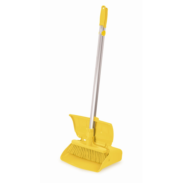 Набор для уборки, состоящий из небольшой метлы (длина рукоятки 60см) и совка для мусора (длина рукоятки 80см и диаметр рукоятки 22мм) с крышкой и колесиками, с фиксатором для соединения рукояток. Щетина средней мягкости, диаметр волосинки 0,5мм, высота - 8 см.