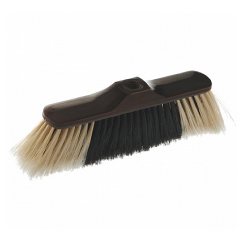 Недорогая щетка для уборки вне помещений выполнена из пластика со щетиной из поливинилхлорида. Средняя часть щетины более мягкая, чем по краям, что позволяет собирать больше пыли. Подходит любая рукоятка с резьбой.