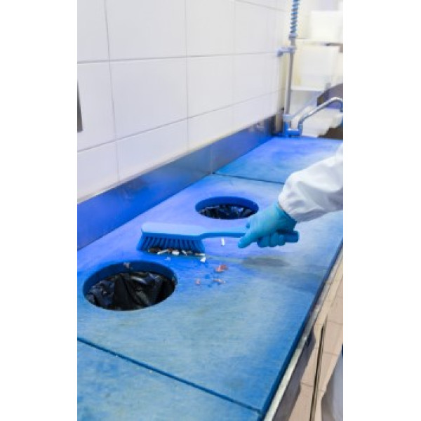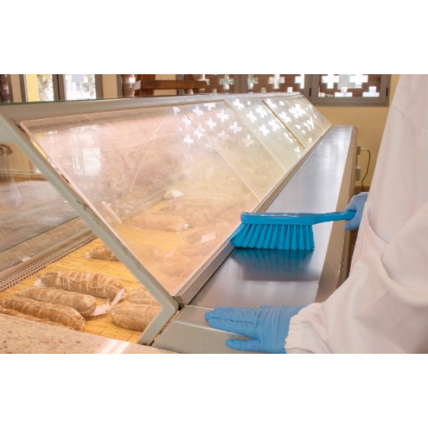 Щетка с мягкой (Ø 0,3 мм) средней длины(5,5см) щетиной выполнена из полипропилена и полибутилентерефталата (PP-PBT) красного цвета, с фигурной ручкой для чистки оборудования с обычными рабочими поверхностями.