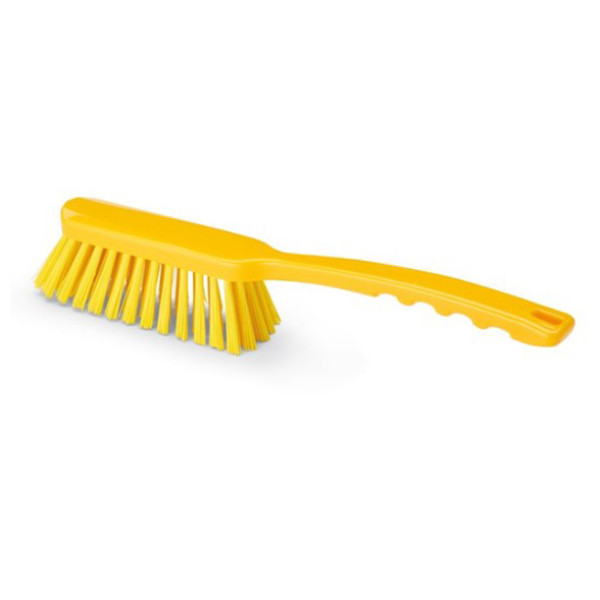 Щетка с мягкой (Ø 0,3 мм) средней длины(5,5см) щетиной выполнена из полипропилена и полибутилентерефталата (PP-PBT) желтого цвета, с фигурной ручкой для чистки оборудования с обычными рабочими поверхностями.