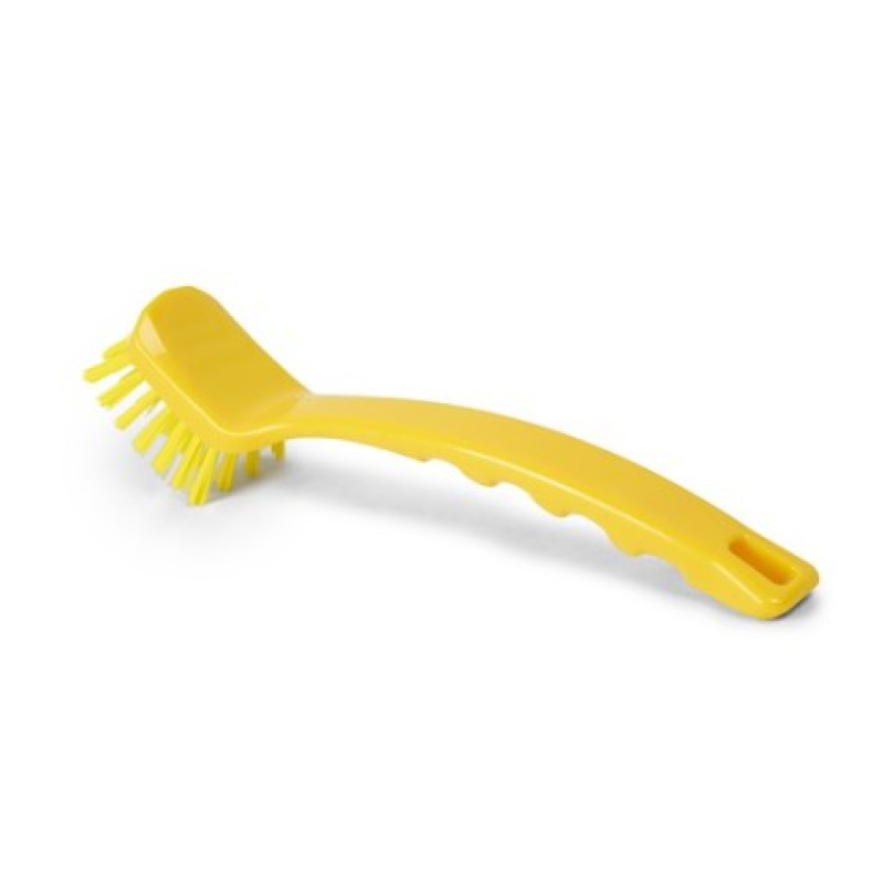 Небольшая щетка с длинной ручкой и короткой щетиной средней мягкости(Ø 0,5мм ) выполнена из полипропилена и полибутилентерефталата (PP-PBT) желтого цвета.