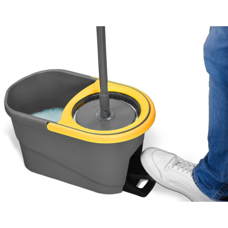 Швабра для мытья полов в комплекте с ведром с педалью для отжима, отжимом из нержавеющей стали, ручкой и мопом из микрофибры, который можно снимать и стирать. Быстро сохнет, можно стирать и сушить. Швабру можно без усилий отжать, просто нажав на педаль ногой. Идеально подходит для всех типов полов.