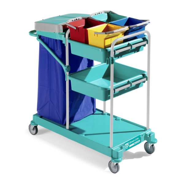 Тележка из полипропилена и металла имеет большую базу на 4 колесах диаметром 100мм. Предназначена для уборки больших и средних помещений, а также собрки мусора. МЕШОК И КРЫШКА В КОМПЛЕКТ НЕ ВХОДЯТ. Можно использовать плотный полиэтиленовый мешок на 120 л, либо при использовании держателя арт.S070340 сбор различного мусора осуществляется в 2 мешка по 70л, либо при использовании разделителя держателя арт. S070345 сбор различного мусора осуществляется в мешки по 30 и 90 л соответственно, либо при использовании разделителя держателя арт. S070335 сбор различного мусора осуществляется в 2 мешка по 70л.