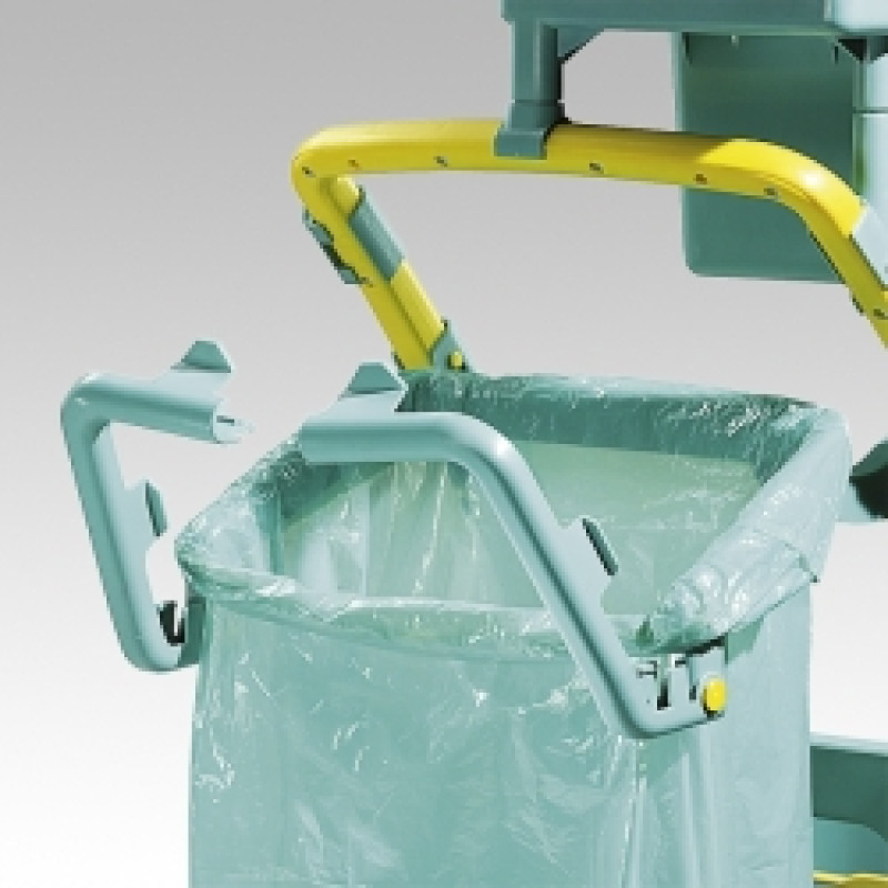Держатель мешка изготовлен из полипропилена зеленого цвета и может устанавливаться только на тележки для уборки серии Nick Plus. Можно использовать как многоразовый мешок для мусора из полиэстра на 50л, так и полиэтиленовый на 60л.