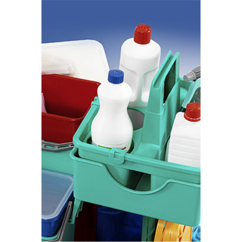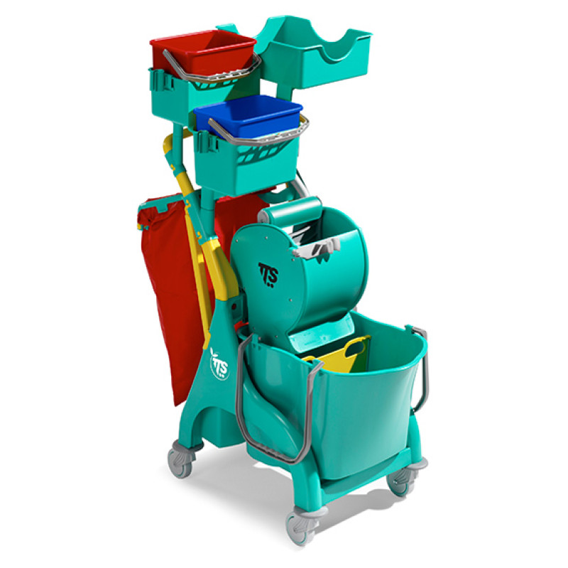 Полипропиленовая тележка на 4-х колесах Ø80 мм с бамперами, одним ведром 28л, двумя 4-х литровыми ведрами, отжимом DRY, держателем мусорного мешка и лотком большим, в котором могут размещаться либо лоток для бутылок либо ведро на 4 л. Можно использовать серую полипропиленовую ручку арт. 3311