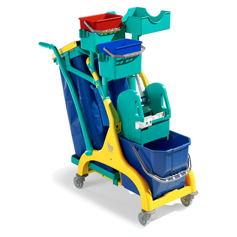 Современный дизайн. Уникальная в своем роде тележка имеет небольшой размер, маневренная, легкая и может вместить большое количество разнообразных аксессуаров для уборки небольших помещений: подметание и мойка полов, уборка пыли, мойка стекол. Все компоненты тележки выполнены из полипропилена, состоит из базы с колесами Ø80 мм и бамперами, ведра 25л, держателя мешка 120л, 2-х 4л ведер, отжима TEC и большого бокового лотка, в котором размещается лоток для бутылок с моющими средствами или дополнительные 4-х литровые ведра .. Мешок в комплект не входит.