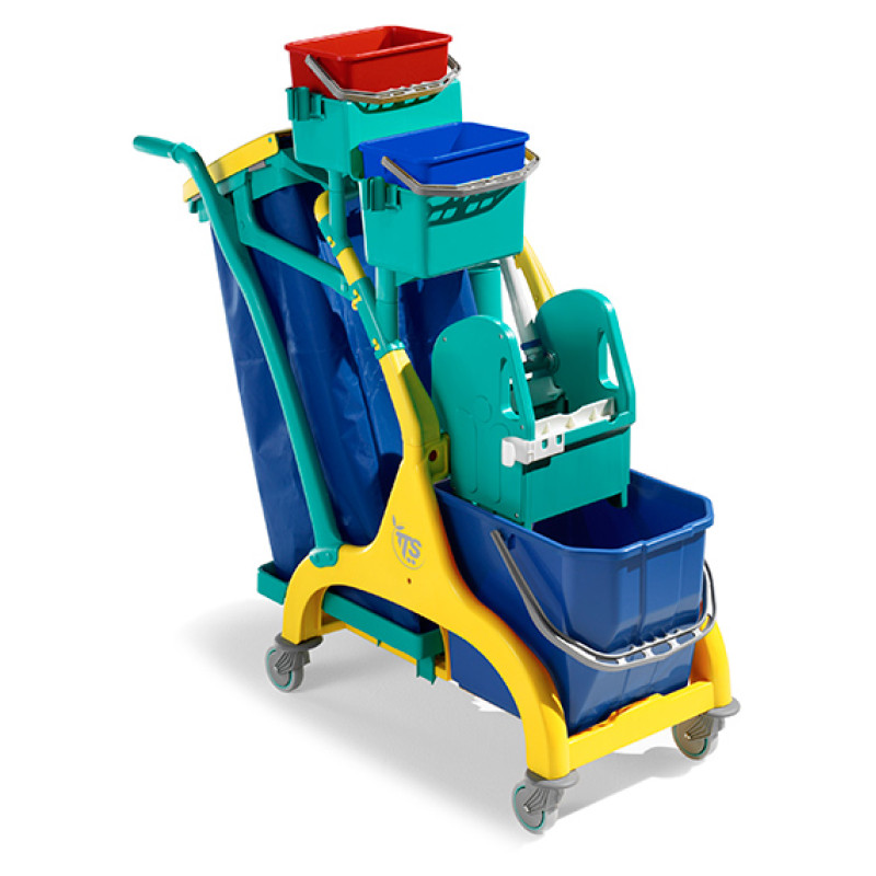 Современный дизайн. Уникальная в своем роде тележка имеет небольшой размер, маневренная, легкая и может вместить большое количество разнообразных аксессуаров для уборки небольших помещений: подметание и мойка полов, уборка пыли, мойка стекол. Все компоненты тележки выполнены из полипропилена, состоит из базы с колесами Ø80 мм и бамперами, ведра 25л, держателя мешка 120л, 2-х 4л ведер, отжима TEC. Мешок в комплект не входит.