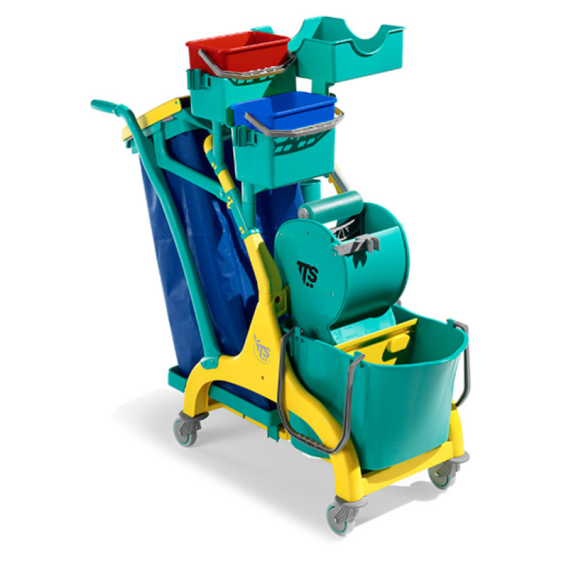 Полипропиленовая тележка может вместить большое количество разнообразных аксессуаров для уборки небольших помещений: подметание и мойка полов, уборка пыли, мойка стекол. Все компоненты тележки выполнены из полипропилена, состоит из базы с колесами Ø80 мм и бамперами, ведра 28л, держателя мешка 120л, 2-х 4л ведер, отжима DRY и большого бокового лотка, в котором размещается лоток для бутылок с моющими средствами или дополнительные 4-х литровые ведра . Мешок в комплект не входит.