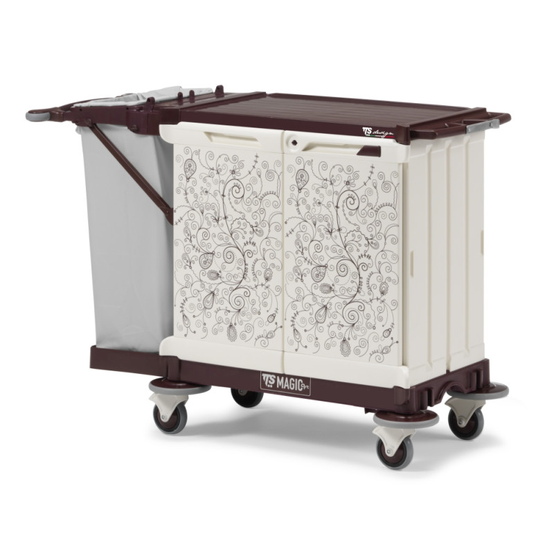 Тележку гостиничную MagicArt ANTHEA 210R-02 можно приобрести под заказ. Предлагается для обслуживания 8/10 гостиничных номеров. Графический рисунок- ANTHEA. Обе дверки закрываются на ключи. Мешок в комплект не входит