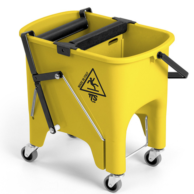 Двойное полипропиленовое ведро для раздельного использования воды для полоскания и моющего раствора объемом 15 л. В комплект входит роликовый отжим, педаль и 4 колеса диаметром 50 мм. Полипропиленовая ручка для переноски ведра.