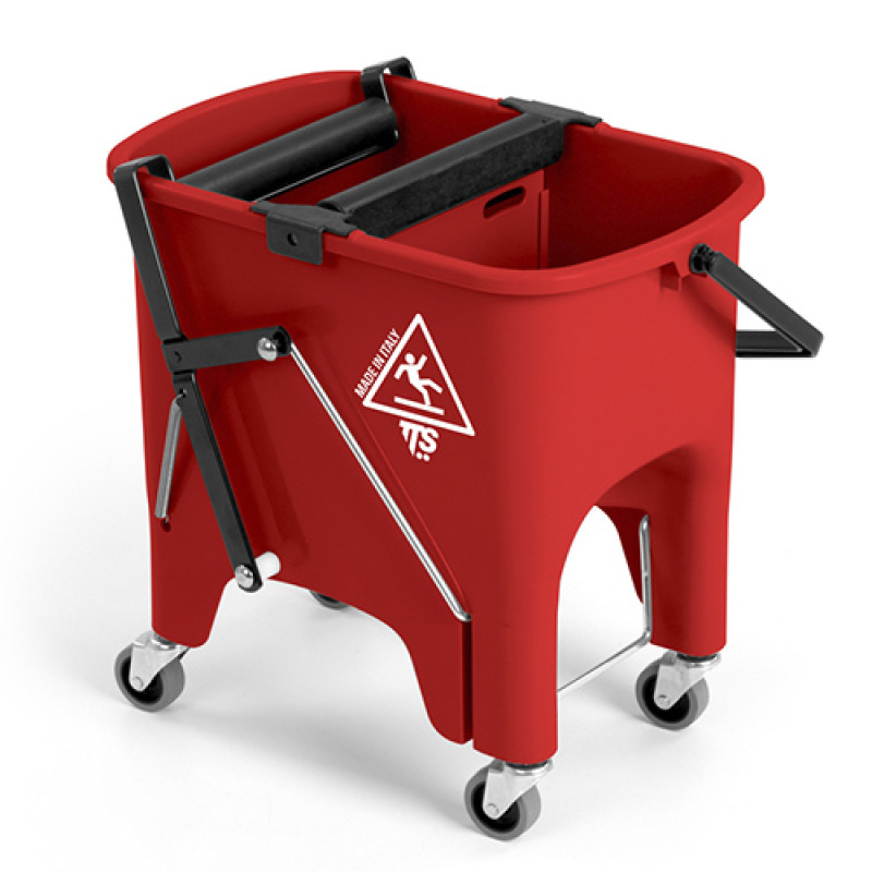 Двойное полипропиленовое ведро для раздельного использования воды для полоскания и моющего раствора объемом 15 л. В комплект входит роликовый отжим, педаль и 4 колеса диаметром 50 мм. Полипропиленовая ручка для переноски ведра.