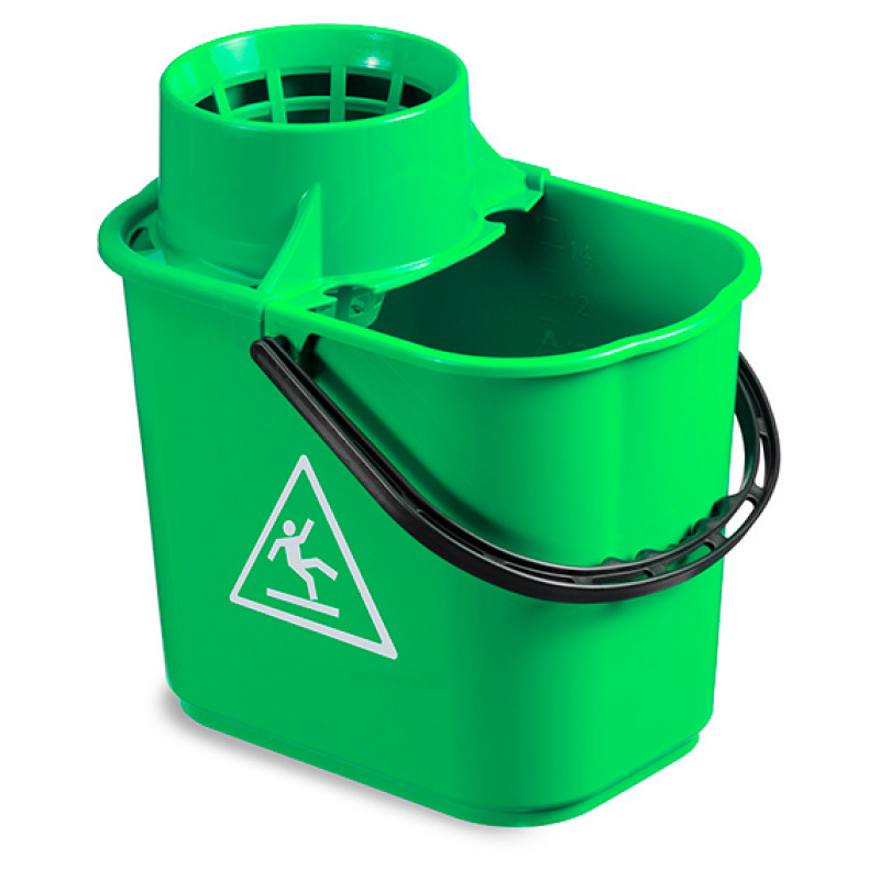 Простое полипропиленовое ведро объемом 14 л с отжимом и ручкой. Хорошо использовать со швабрами с веревочным мопом. Для отжима достаточно провернуть швабру в отжиме.