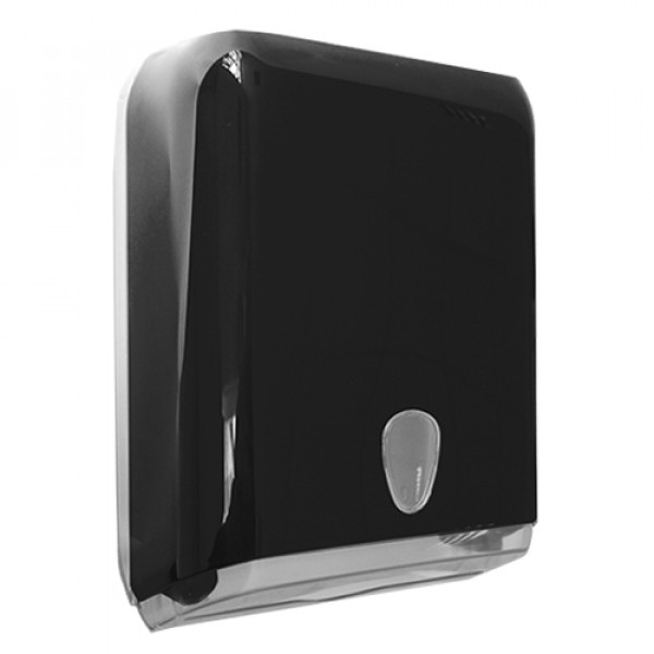 Держатель бумажных полотенец PRESTIGE имеет узкий корпус: стильный и компактный. Вместительны и надежны, вмещает 2 пачки бумажных полотенец. Габаритные размеры - 375x280x130 мм. Изготовлен из высокопрочного пластика черного цвета. Тип используемых полотенец – пачки (V-складка). Смотровое окно в виде капли позволяет контролировать наличие бумаги в диспенсере. Замок расположен сверху для удобства дозаправки расходных материалов