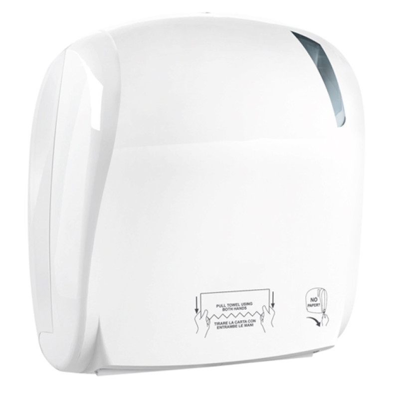Держатель бумажных рулонных полотенец автоматический LINEA SKIN (ручная подача бумаги, отрыв автоматический)с окном просмотра на фронтальной стороне держателя. Большая вместимость сокращает частоту перезаправок. При вытягивании полотенца двумя руками лист полотенца обрезается ножом автоматически. Корпус держателя изготовлен из ударопрочного прозрачного пластика. Габаритные размеры – 371x330x221 мм. Предназначен для бумажных полотенец в рулонах с диаметром не более 190 мм без перфорации. Закрывается на замок. Подходят рулоны высотой до 220 мм.
