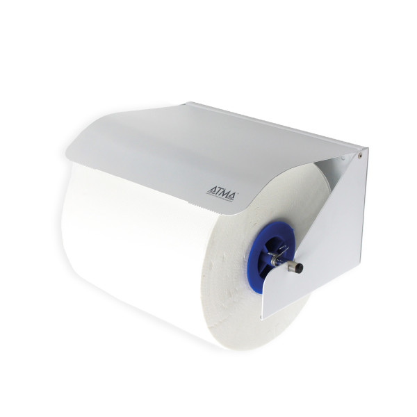 Держатель бумажных рулонных полотенец. Этот настенный держатель используется для промышленных бобинных протирочных бумажных полотенец. Изготовлен из металла, покрытого эпоксидной краской белого цвета. Устойчив к поломкам. Имеет нож для обрыва полотенец.