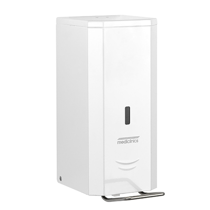 Дозатор для дезинфицирующего средства емкостью 1,5 л, изготовлен из нержавеющей стали AISI 304 толщиной 0,8 мм, окрашенной белой краской, устанавливается непосредственно на стену и управляется с помощью рычага из нержавеющей стали. Эта модель дозатора имеет функциональный, прочный и модный дизайн, который соответствует новому ассортименту аксессуаров для ванных комнат Mediclinics, что позволяет этому диспенсеру идеально вписаться в любое пространство.