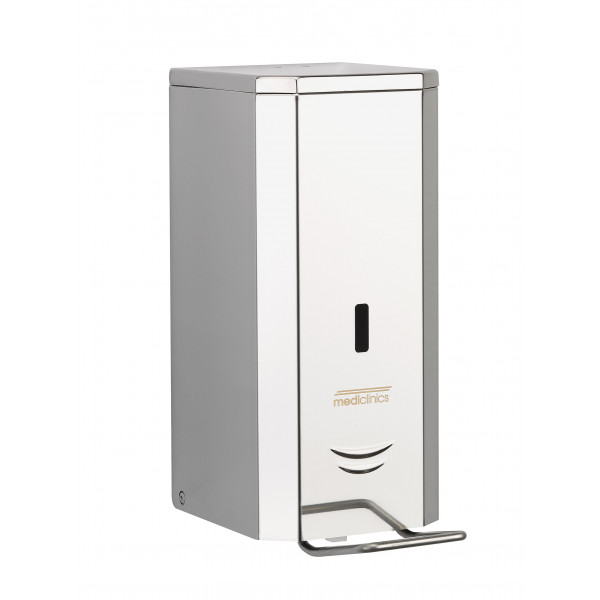 Дозатор для дезинфицирующего средства емкостью 1,5 л, изготовлен из нержавеющей стали AISI 304 толщиной 0,8 мм, с глянцевой отделкой, устанавливается непосредственно на стену и управляется с помощью рычага из нержавеющей стали. Эта модель дозатора имеет функциональный, прочный и модный дизайн, который соответствует новому ассортименту аксессуаров для ванных комнат Mediclinics, что позволяет этому диспенсеру идеально вписаться в любое пространство.
