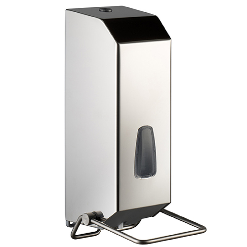 Прямоугольный дозатор жидкого мыла с локтевым приспособлением, обладает износостойкими свойствами и устойчив к механическим повреждениям. Изготовлен из нержавеющей стали c глянцевым покрытием. Имеет окно на корпусе для контроля наполнения жидкости.