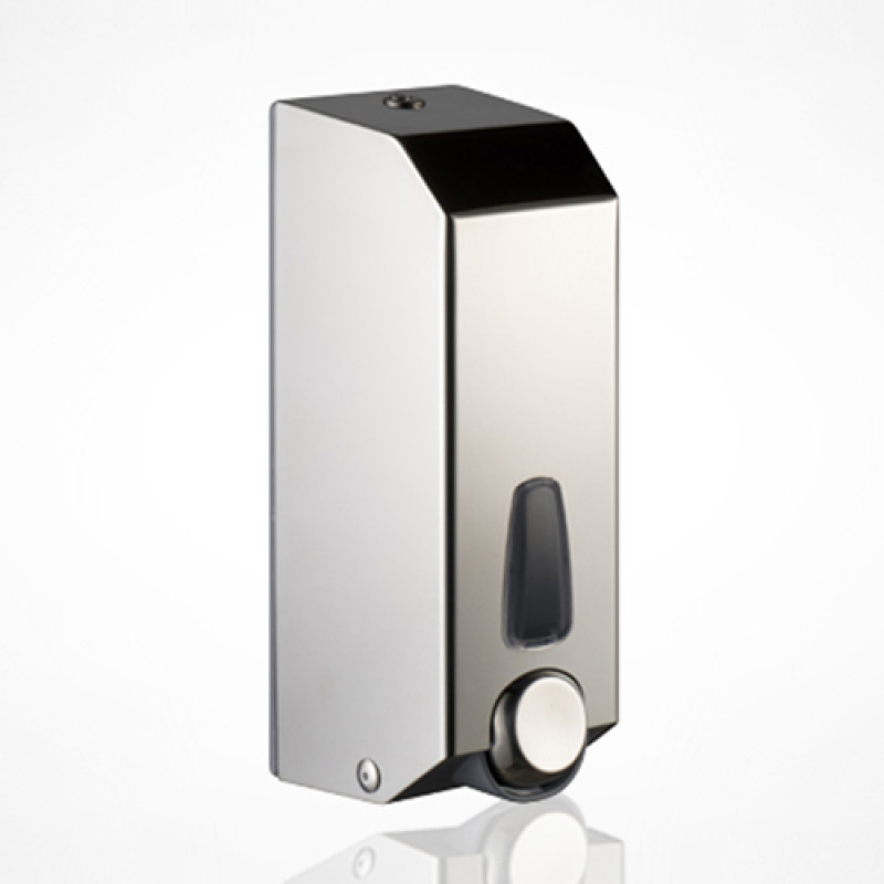 Прямоугольный дозатор жидкого мыла устойчив к механическим повреждениям. Изготовлен из нержавеющей стали c глянцевым покрытием. Имеет окно на корпусе для контроля наполнения жидкости.