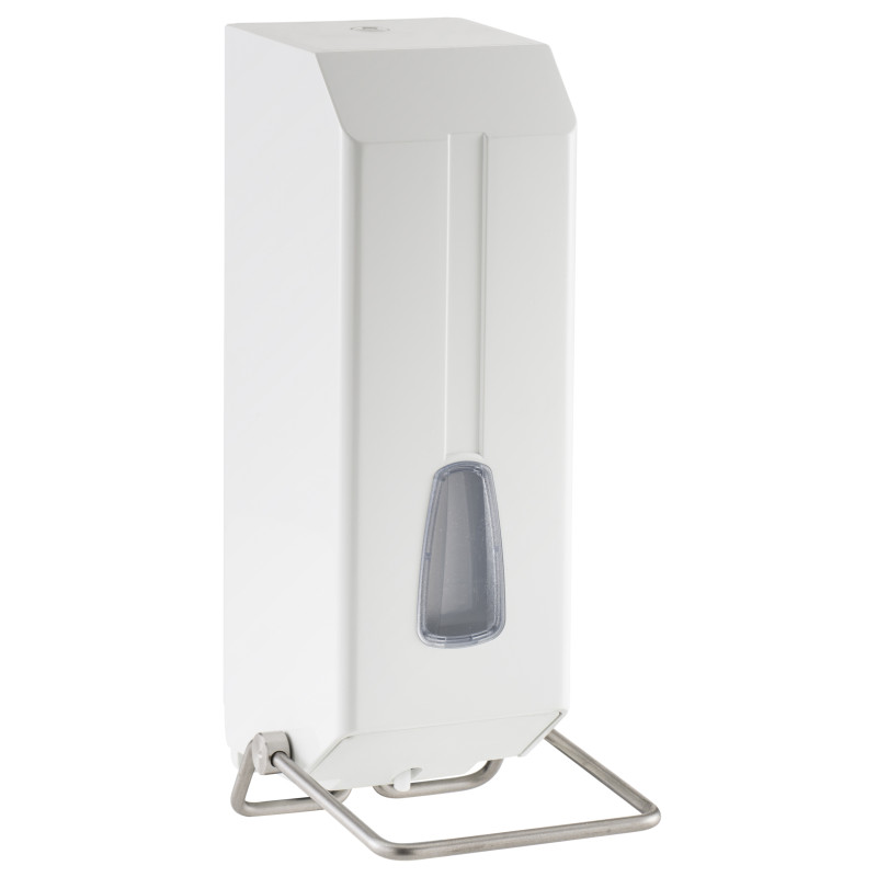 Прямоугольный дозатор жидкого мыла с локтевым приспособлением, обладает износостойкими свойствами и устойчив к механическим повреждениям. Изготовлен белого пластика. Имеет окно на корпусе для контроля наполнения жидкости.