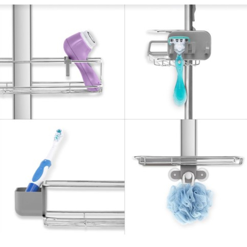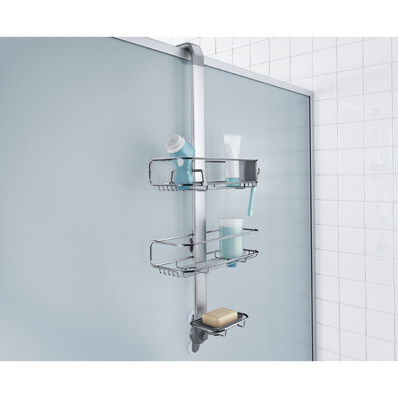 Наша стойка с полочками позволяет великолепно организовать место в душевой кабине. Установка очень проста - подвесьте регулируемую стойку к двери и она автоматически закрепится с помощью крюка.