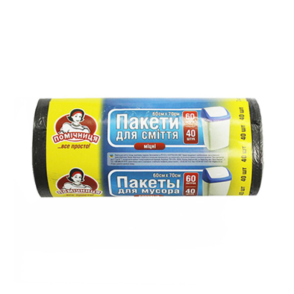Мешки для мусора полиэтиленовые Помічниця черные, толщина - 11-12 мкн. Изготовлены из первичного и вторичного сырья, спайка - "звездочка".