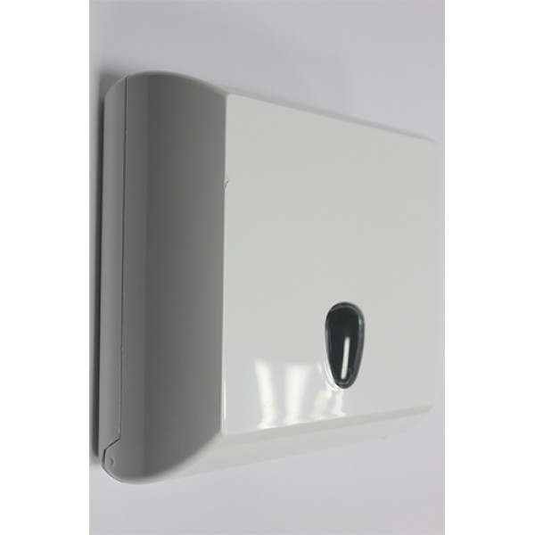Держатель бумажных полотенец PLUS, классический дизайн подойдет для любой санитарной комнаты. Вместительны и надежны, габаритные размеры – 300x136x290 мм. Изготовлен из высокопрочного пластика белого цвета. Тип используемых полотенец – пачки (V -складка) с листами размером 21х22 см). Простой в обслуживании, боковое открывание крышки - легко перезаполнить. Закрывается на ключ. Смотровое окно в виде капли позволяет контролировать наличие бумаги в дозаторе.