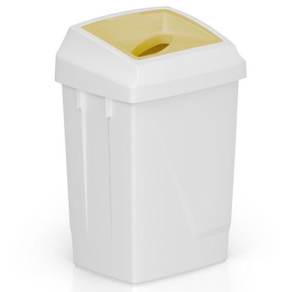Урна для мусора белого цвета оснащена желтой крышкой с овальным отверстием. Для удобства утилизации мусора верхняя часть урны сделана съёмной.